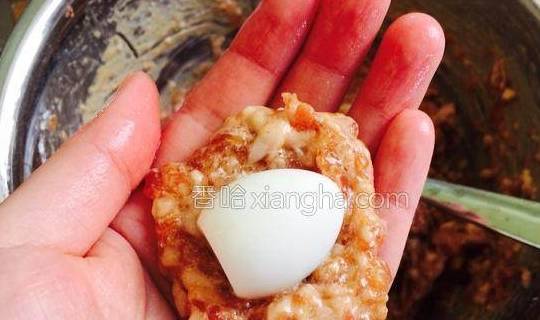 7.鹌鹑蛋剥皮,手上蘸少许水或者戴上一次性手套,舀一勺肉馅放在手上压扁,放入一颗鹌鹑蛋。