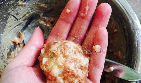 5.肉馅搅拌的比较干了加入适量的葱姜水继续搅拌。