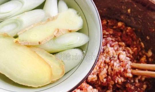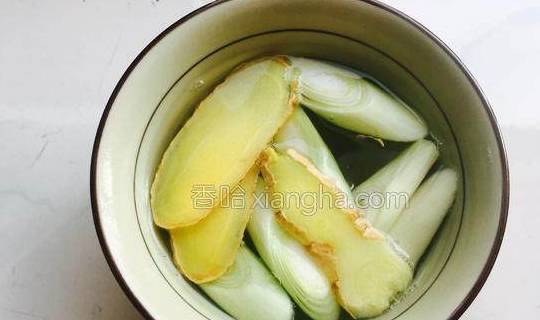 2.姜切片,葱切断放入碗中,加入开水浸泡。