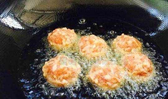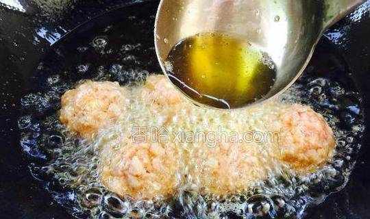 10.中火炸丸子,用勺子舀油淋在丸子表面定型。