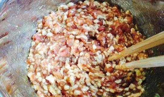 4.用筷子顺着一个方向搅拌上劲,如果你有电动打蛋器也可以用,这样做出来的肉馅更黏稠。