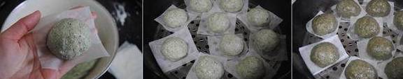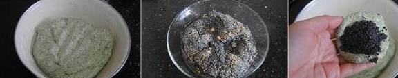 6,取一个艾草糯米团,大小看个人喜欢,放入花生芝麻馅