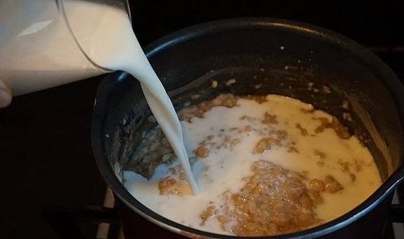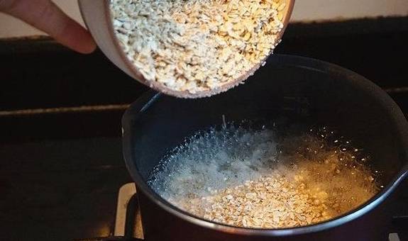 2.待锅里的水烧开后,将燕麦片倒入