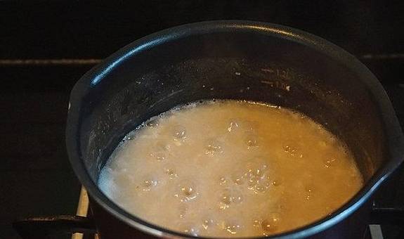 3.小火熬煮沸至软糯后,调小火