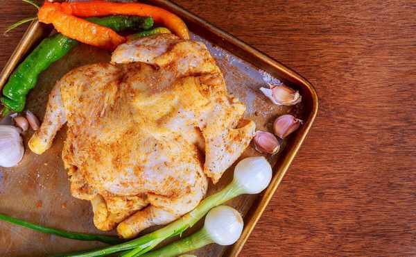 鸡去头、去屁股后,用流水冲洗干净,将鸡的表面和内部冲洗干净,将鸡身上的水擦干。