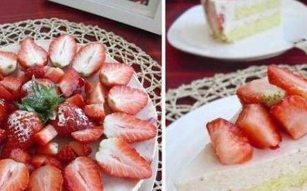 将戚风蛋糕均匀分三片,取2片待用,其中一片用切去2厘米左右外圈淡奶油打发至7分(还有些许流动性)吉列丁片用凉水浸泡五分钟后捞出待用白砂糖加入牛奶中,再放入泡好的吉列丁片,隔水加热至糖和吉列丁片都融化,放置晾至室温g草莓切碎放入搅拌机搅拌成草莓酱,另外500g部分切片部分切丁部分保证完整(根据实际用途调整草莓的量)将草莓酱加入牛奶中,拌匀,再一起加入打发至7分的淡奶油中准备模具,将一片8寸的戚风蛋糕片放入底部,再将切成两半的草莓沿模具壁放置(切面贴模具壁)倒入一层草莓酱淡奶油混合酱(此步骤可以依个人喜好放入草莓碎或草莓片),抹平,再放入小一圈的戚风片继续倒入混合果酱,抹平,轻轻震动震出气泡,放入冰箱冷藏四小时后,用吹风机吹模具壁即可轻松脱模脱模后根据自己的喜好装饰表面,也可以不装饰直接品尝
