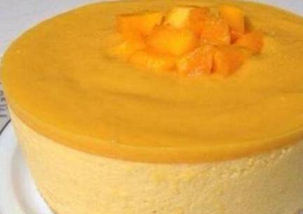 用料:芒果肉450g、吉利丁片12g+5g、牛奶50g、淡奶油200g、细砂糖20g、戚风或海绵蛋糕2片、柠檬汁一大勺、朗姆酒半勺。