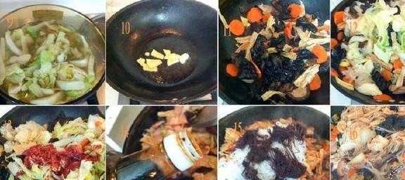 8-9胡萝卜,云耳和木耳,分别用开水飞水5分钟。捞起,沥干水份。白菜过水捞出。10锅烧热放2汤匙油,把姜片略爆香下红萝卜,冬菇,云耳,木耳,腐竹翻炒。