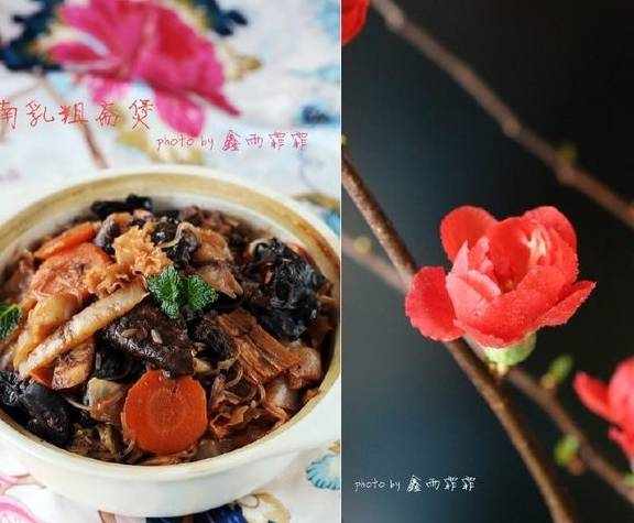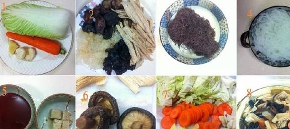 2-4预先把冬菇,云耳,木耳,枝竹,粉丝,发菜分别用水浸至软身。5南乳汁和腐乳捣碎混合。