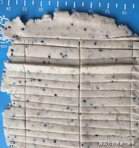 5.用擀面杖擀成薄片,再用刮刀切成小条。