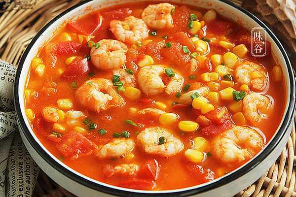 【食材】:西红柿 适量、鲜虾 适量、盐 1小勺、胡椒粉 少许、玉米粒 适量、生抽 1勺、料酒 1勺、