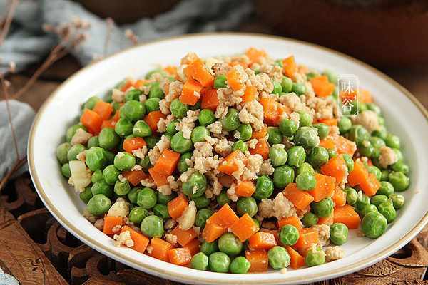 【食材】:豌豆 适量、姜蒜 适量、胡萝卜 适量、生抽 1勺、猪肉 适量、盐 1小勺、淀粉 1小勺、老抽 1勺、蚝油 1勺、