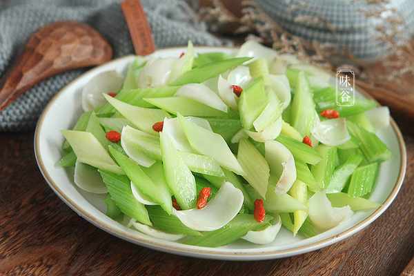 【食材】:百合 适量,西芹 适量,姜蒜少许,鸡精 少许、枸杞 适量,盐 少许,