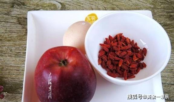 3、准备配料,花牛苹果1个,去皮洗净,鸡蛋1个,枸杞子适量,加入适量的水浸泡1~2分钟清洗干净。