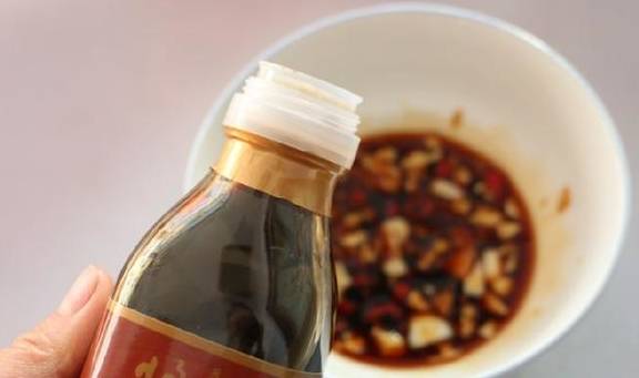 5.将调好的料汁一半淋在金针菇上。