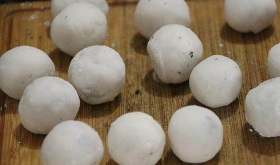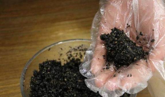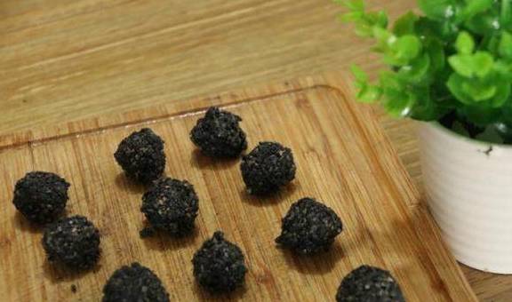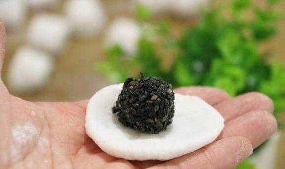 等猪油冷却后,用手将黑芝麻揉成小一些的球球