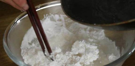 锅里继续烧一些热水,一定要开了之后,迅速倒入木薯淀粉中,倒入开水的时候,一定要用筷子快速搅拌均匀,否则木薯淀粉就会有一些小疙瘩。