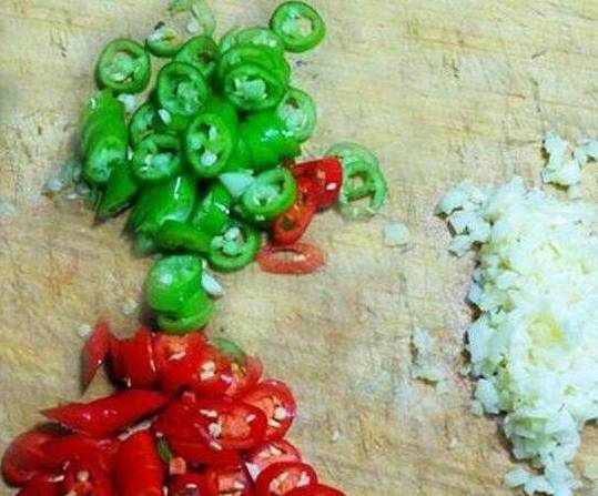 红辣椒、青辣椒、蒜剁碎,然后热锅热油,爆香。