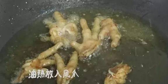 油热后放凤爪,炸到金黄即可