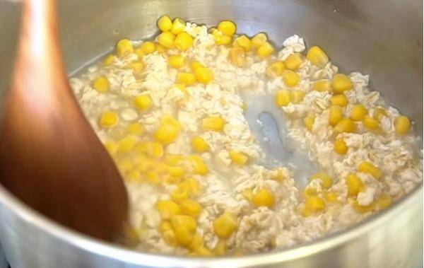 1取一锅,倒入水、燕麦片、玉米粒拌煮至汤汁略微浓稠。
