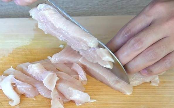 2将鸡胸肉切薄后,再切成细条。