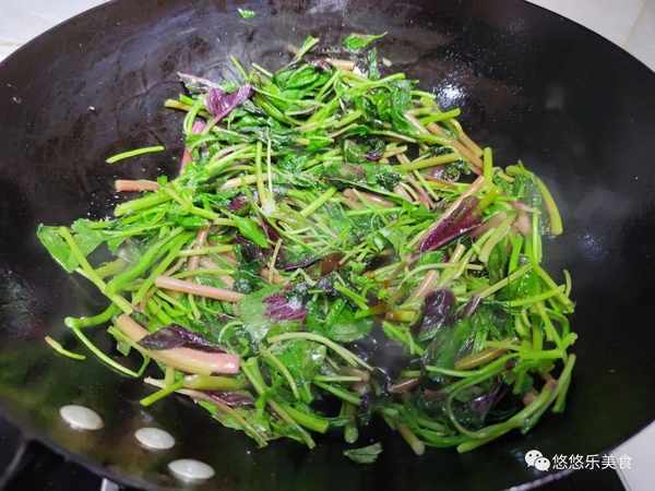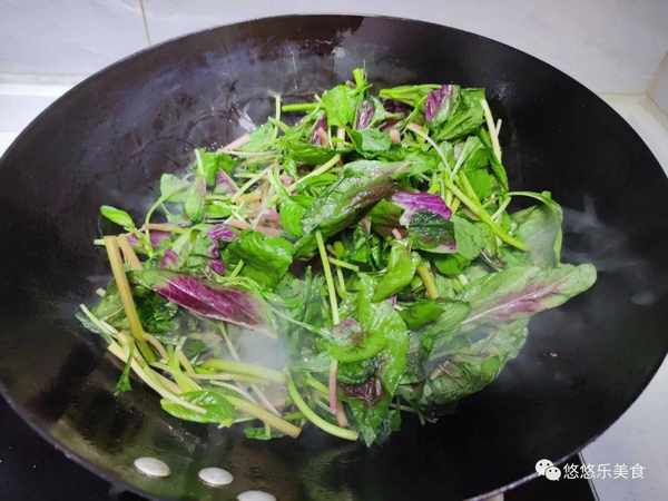 2.炒青菜的时候一定要热锅,而且油的量可以稍微多一点,这样炒出来的青菜润泽好吃。锅中烧热加油,锅中的油有点冒烟之后赶紧把红苋菜倒入里面。苋菜下锅后用大火多翻动,快炒一下,如果下锅没有及时炒的话,很容易就会把叶子煮焦了,这样会影响口感。炒好之后我们多翻动一下,将锅中的苋菜炒至发软,然后看一下,可以的话加入适量的蚝油跟食盐调一下味再给它炒均匀。