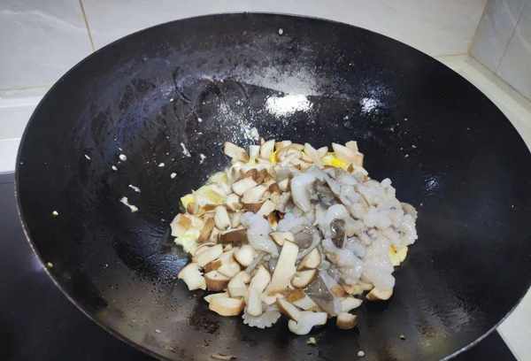 6、然后在锅里放少量油,然后把虾仁和虾皮放入盛有油的锅中用小火煎,煎的时候要经常翻动。烤香后加入适量的蚝油和盐调味,更入味。
