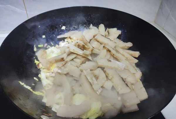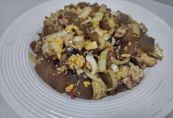 红薯饼在锅里炒匀后,QQ跳起来看起来十分诱人。加入一些小菜,拌匀炒香,熄火起锅。