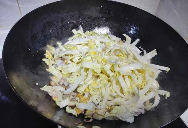 然后我们再倒白菜,白菜的湿度很大,我们把它放在锅里用大火快速炒,多拌一下,把白菜炒软;
