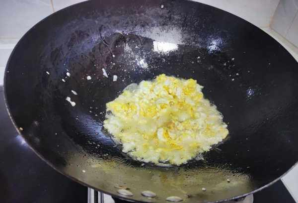 5、鸡蛋表面洗净,洗净的鸡蛋放在一边。锅中倒入油,将鸡蛋打散放入锅中,用铲子翻过来,将鸡蛋在锅中煎至破裂,取出煎好的鸡蛋备用;