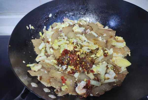 7、锅里的白菜炒好后,加入适量的盐和蚝油,炒至顺滑香滑。然后把鸡蛋倒进去,再把做好的红薯饼放在上面。把红薯粿放在锅里,要经常翻动,因为白菜炒的时候会出很多汁。这个时候红薯粿就可以炒的更好了。红薯饼吸收了白菜汤,炸的时候味道更好;