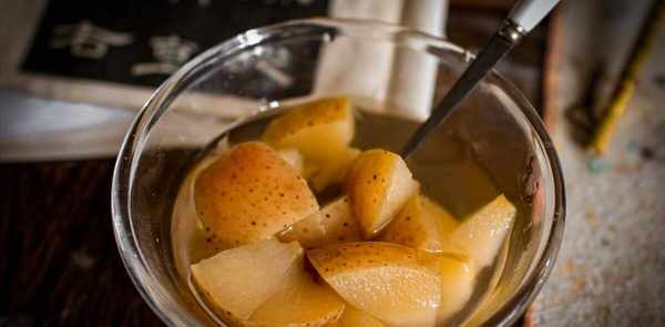 然后准备一个砂锅。请记住,您可以在这里使用玻璃盘或砂锅。切勿使用金属。将洗净的山楂、干辣椒、生姜全部放入锅中,加水两公升,盖上锅盖。将水先用大火烧开,再用小火慢炖,让这些食材的营养和味道完全被水吸收。当水沸腾时,煮沸约五分钟。现在我们准备雪梨,将其清洗并放入烤箱。.盖上盖子,继续用小火煮15分钟。