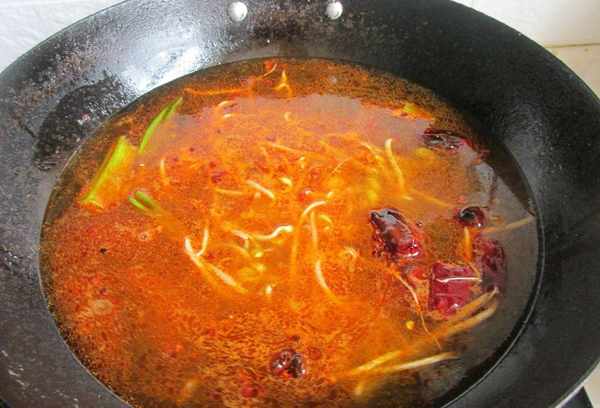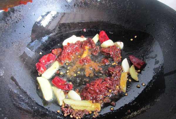 第二步:锅内放花生油,放入葱、姜、蒜炒香,加入花椒、郫县水、干辣椒、红油加少许生抽炒香。家里的调料不多,可以直接用红油火锅的料,味道也很好。