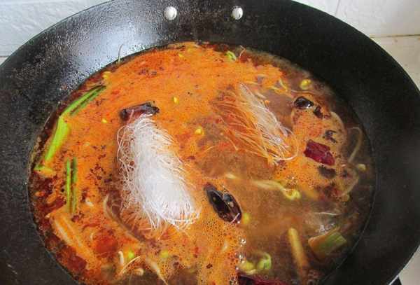 第四步:加入所需量的粉丝,继续煮2分钟。不喜欢粉条的可以不放。通常,酸菜鱼上面有粉丝,但没有辣鱼。但是我的家人喜欢它,所以我在上面放了一些。