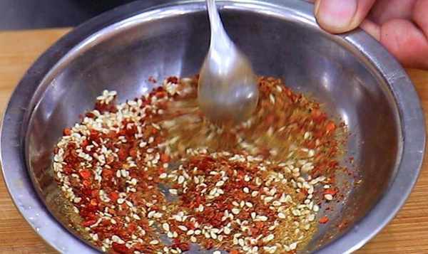 3、准备一个小碗,放入适量的辣椒粉、孜然、花椒粉和少许白芝麻,搅拌均匀备用。