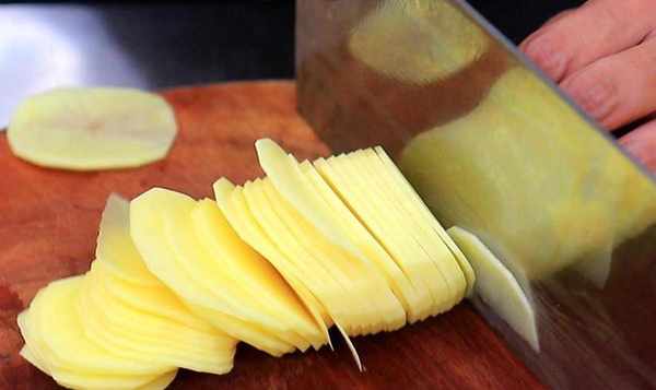 1、准备两个土豆,洗净去皮,切成均匀的薄片。切好后放入锅中煮一会,变色后捞出,放凉备用。
