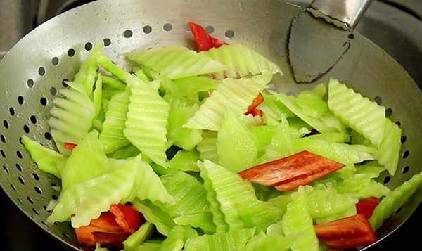 1.准备两颗生菜,剥去外皮和里面的白色粗纤维,洗净用斜刀切段,再切成菱形薄片;切一些红辣椒片以匹配颜色。