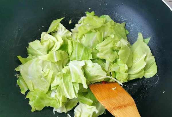 2.煎锅加入食用油。油热后,将准备好的葱蒜片和干辣椒放入锅中炒香。大火炒香。紧接着加入一匙熟醋,快速翻炒,然后加入准备好的白菜。