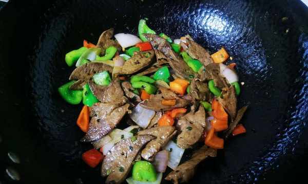 3、然后加入准备好的猪肝,大火炒出水分。接下来,将准备好的青椒放入锅中,加入生抽醋和精盐调味。快速搅拌均匀。