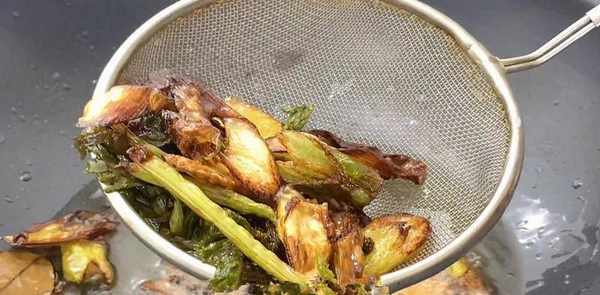 锅内倒入适量食用油,油热后倒入所有葱姜材料,将葱姜炒香,用漏勺捞出沥干。用于煎炸的食用油储备。