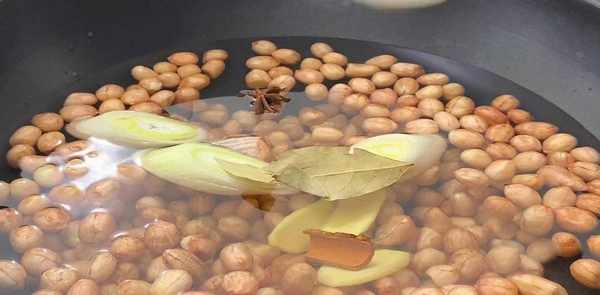 开锅,放入适量的水,将泡好的花生仁放入锅中过冷水,加入少量葱、姜、八角、桂皮、月桂叶和适量的盐,煮至大火煮开,把水烧开,中火煮十分钟。