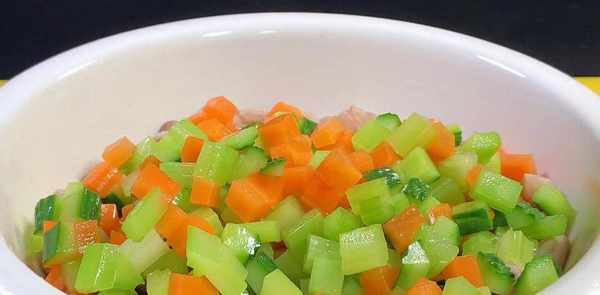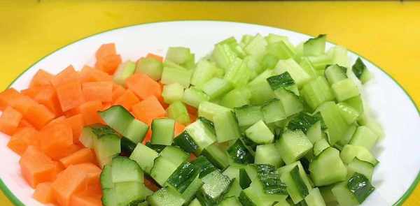 胡萝卜一根去皮,先切成厚片,再切成条状,最后切成花生大小的方块,芹菜两根切成条状,再切成小方块,半根黄瓜切成方块,将骰子放入彩米大小的盘子里。