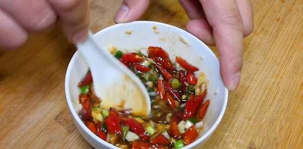 准备酱汁,小葱两根,葱花切段,大蒜压碎几粒切碎,将葱花和蒜末放入碗中,红辣椒切几片,加入小半份烤好的花椒粉,倒入一勺热油,带出香味。