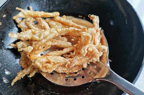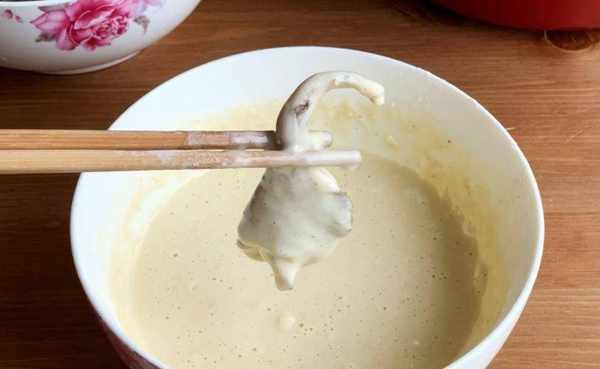第三步,将腌制好的香菇,用手捏碎一点,然后放入面糊中搅拌均匀,锅中倒入足量的食用油,烧热后将香菇逐块放入锅中,先把蘑菇全部炸好,然后捞出来,等油热了,再炸一遍,把吸入蘑菇里的食用油吐出来,这样蘑菇吃起来才不会腻,吃起来会更脆。