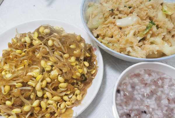 豆芽粉丝:将买来的豆芽用水冲洗干净,沥干水分,将粉丝用温水泡软。锅内倒入油,加入葱姜爆香,炒豆芽,加入生抽和胡椒粉,将豆芽炒碎,倒入粉丝,加少许水,小火焖煮在高温下加热五分钟。锅。