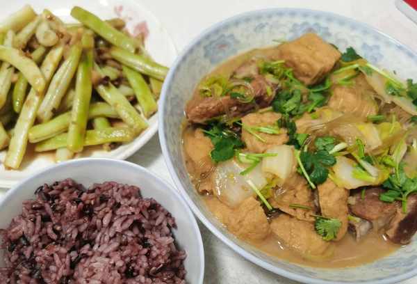油豆腐红烧排骨:先用油将排骨炸熟,待表面微焦时,加入葱、姜、花椒、八角炒香,倒入生抽、老抽、蚝油、加适量清水炖二十分钟。然后把炸好的豆腐、白菜、粉条依次放好,炖好后,再炖两三分钟就可以吃了。