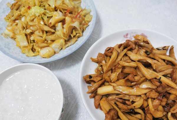 杏鲍菇炒肉:将肉切条备用,杏鲍菇撕成长条。锅内放适量油,先将肥肉放入锅中炒出肥肉,再加入瘦肉、葱姜片,倒入生抽、蚝油和盐,翻炒——炒香,倒入平菇,开大火,炸熟。