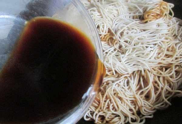 7.加入新鲜面条,盖上盖子,用小火煮约10分钟。这时,里面的水分很少。
