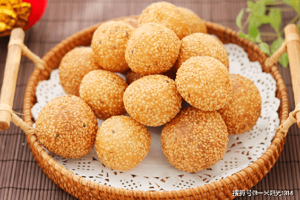 麻团 济南的麻团,由南方引进,是用糯米粉加白糖、油和水揉制成团形,外面粘上芝麻,馅心为红豆沙,入锅油炸而成。因其呈圆团形,表面又沾裹有芝麻,故名
