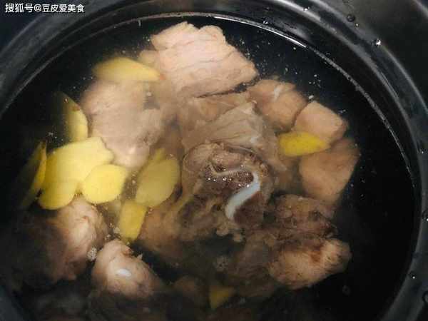 3、把排骨放入砂锅里,加入适量的水,放入姜片,盖上盖,大火煮开,转小火,慢慢炖煮40分钟。